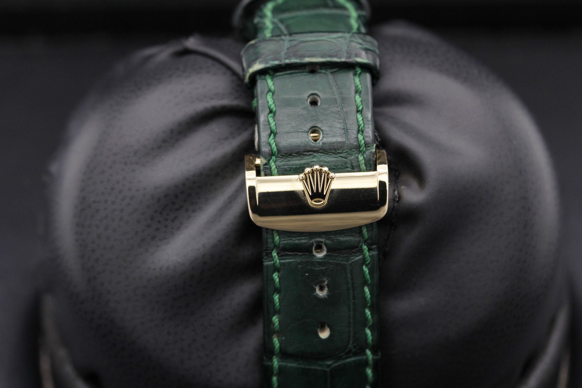The Rolex Day-Date 36, Reference 118138, is a striking and sophisticated timepiece, featuring a vibrant green dial paired with luxurious yellow gold. Finished with an elegant alligator leather strap, this watch is a bold expression of refined style.